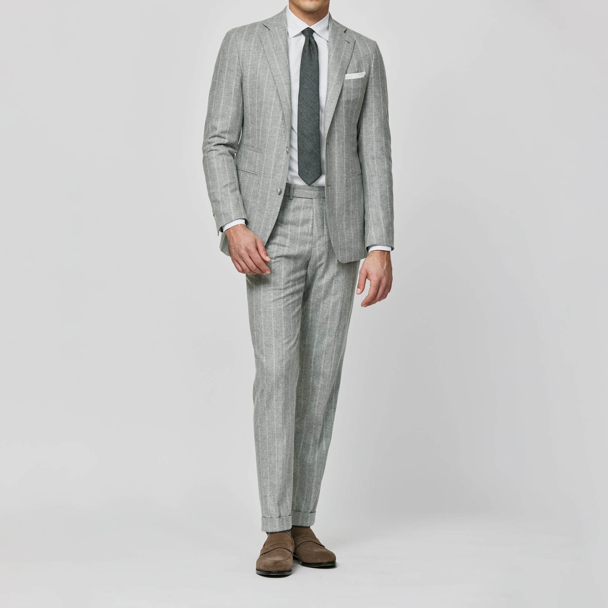 Stone grey wool-cashmere suit with chalk stripe